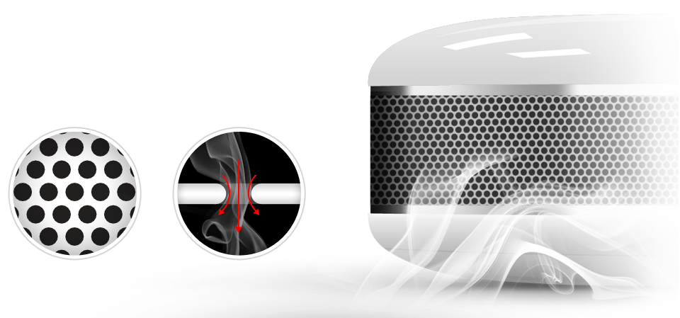 Ultra small housingFibaro Smoke Sensor is probably the smallest wireless smoke sensor in the World. Advanced production technology allowed to significantly minimize the sensor components, making Fibaro sensor the most advanced device of that type available on the market, and our company the leader in the manufacture of wireless smoke sensors. These are the words describing Fibaro Smoke Sensor's grille. At first glance this shiny element may seem to be a piece of jewelry, however it's one of the most important components of the device. Its perforation lets the smoke into the sensors chamber. The better made, the smaller amount of smoke is needed to discover threat and trigger the alarm. Our sensor's grille is made of top quality material, with huge number of holes in it. Each one of them was electrochemically shaped, so that smoke entering the housing is accurately guided into sensor's chamber. Detecting fire quickly, FIBARO Smoke Sensor provides ultimate protection, minimizing damages.